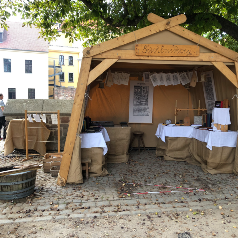 Mit der historischen Schauwerkstatt wird das alte grafische Gewerbe abgebildet. Auf fünf Mittelaltermärkten zeigen wir das Drucken im Buchdruck nach Gutenberg, das Papierschöpfen von Hand und einzelne Buchbindetätigkeiten.